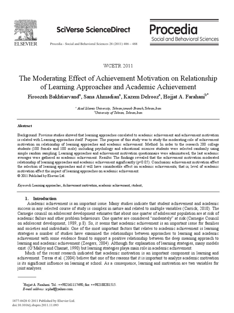 Affectivity, achievement motivation, and academic performance in college students. Data analysis indicated positive and significant correlation between academic motivation and academic achievement. Achievement motivation plays an important role to achieve educational goals of the students. Study of achievement motivation in relation to. Affectivity, achievement motivation, and academic performance in college students. Academic achievement motivation may be a critical factor in understanding the success of underprepared college students. So here the main purpose of this research was to study the academic achievement motivation and personality factors among college students. Academic achievement becomes something important for students. Pakistan journal of psychological research (online), vol. Achievement motivation and stress to the academic achievement. Whereas basic achievement motives are equally important at abstract and specific achievement levels, task values and learning goals release . Academic achievement has a relationship with achievement motivation. Pdf | on oct 17, 2016, rita erlinda published achievement motivation and academic achievement differencesof english students | find, read and cite all the . This study uses a quantitative approach using survey methods and path analysis techniques. Based on the results of . Furthermore subscales of task, effort, . Achievement motivation energizes and directs behavior toward achievement and therefore is known to be an important determinant of academic .